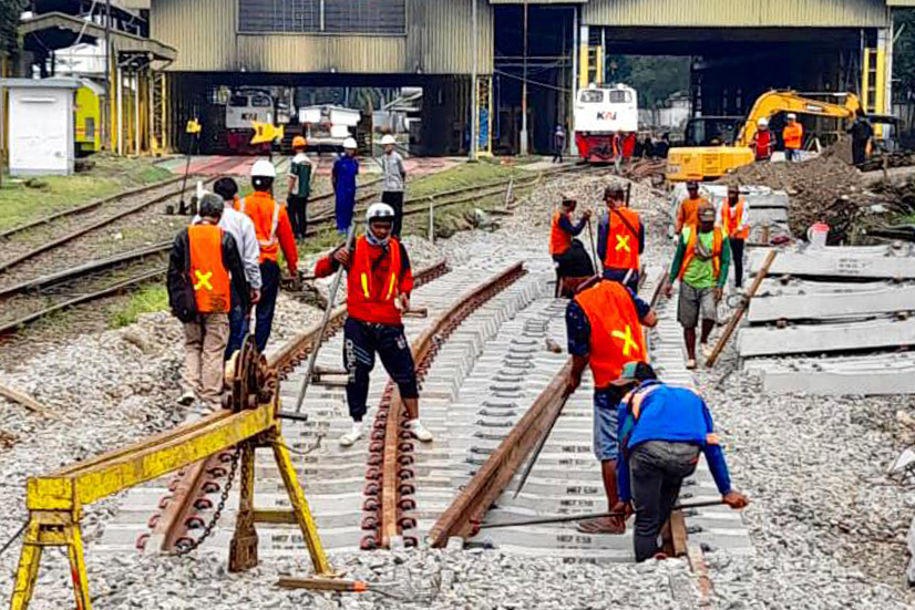 Layanan pemasangan, perapihan, pengelasan dan stapling rel atau sambungan rel kereta api.